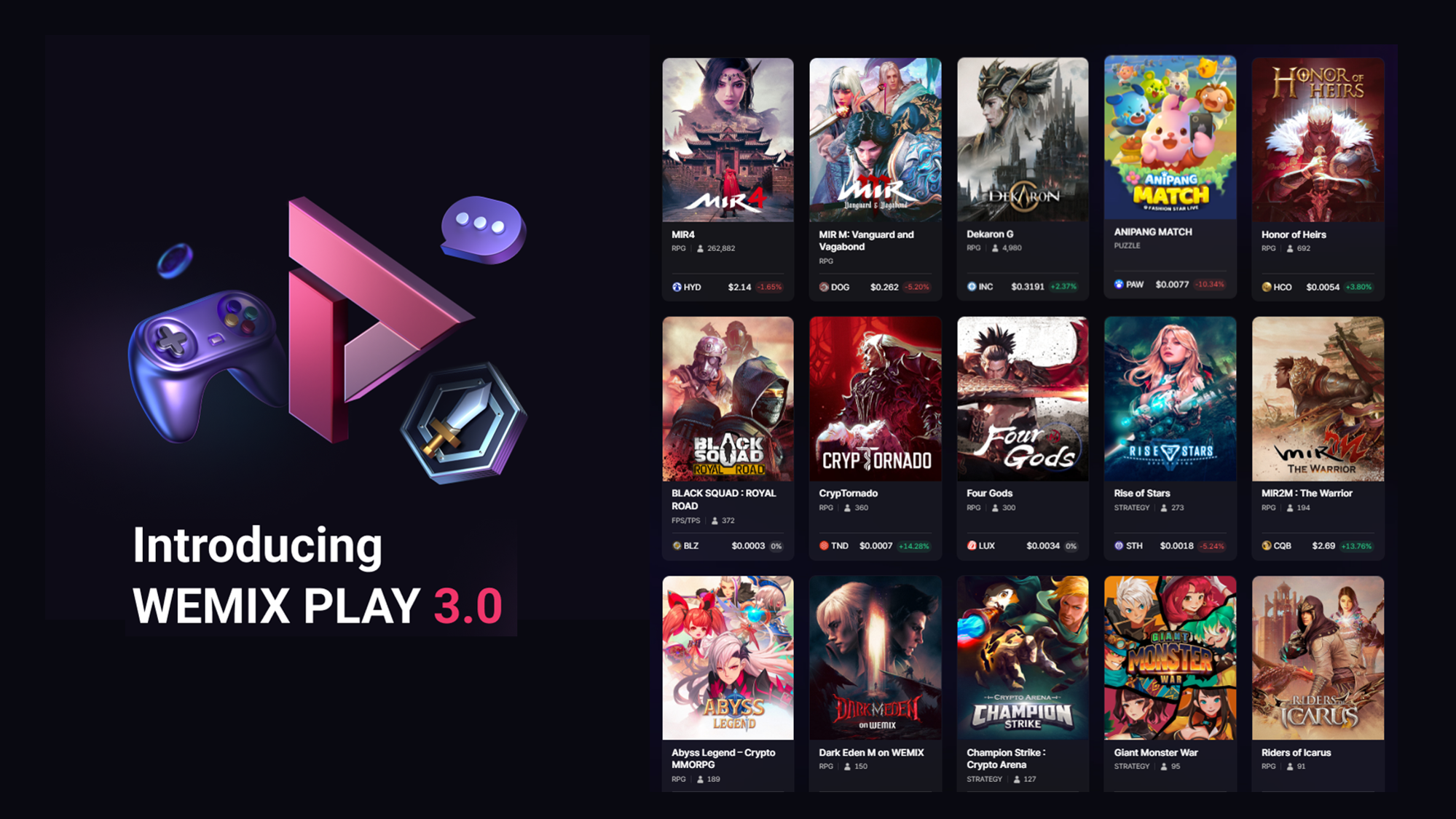 2022年7月に正式ローンチしたブロックチェーンゲームプラットフォーム「WEMIX PLAY」は、MIR4 Global、MIR M Globalを含め、約30種のブロックチェーンゲームがサービス中であり、既に契約済みで正式リリースを準備しているタイトルは約80以上の巨大プラットフォームとなっている。
